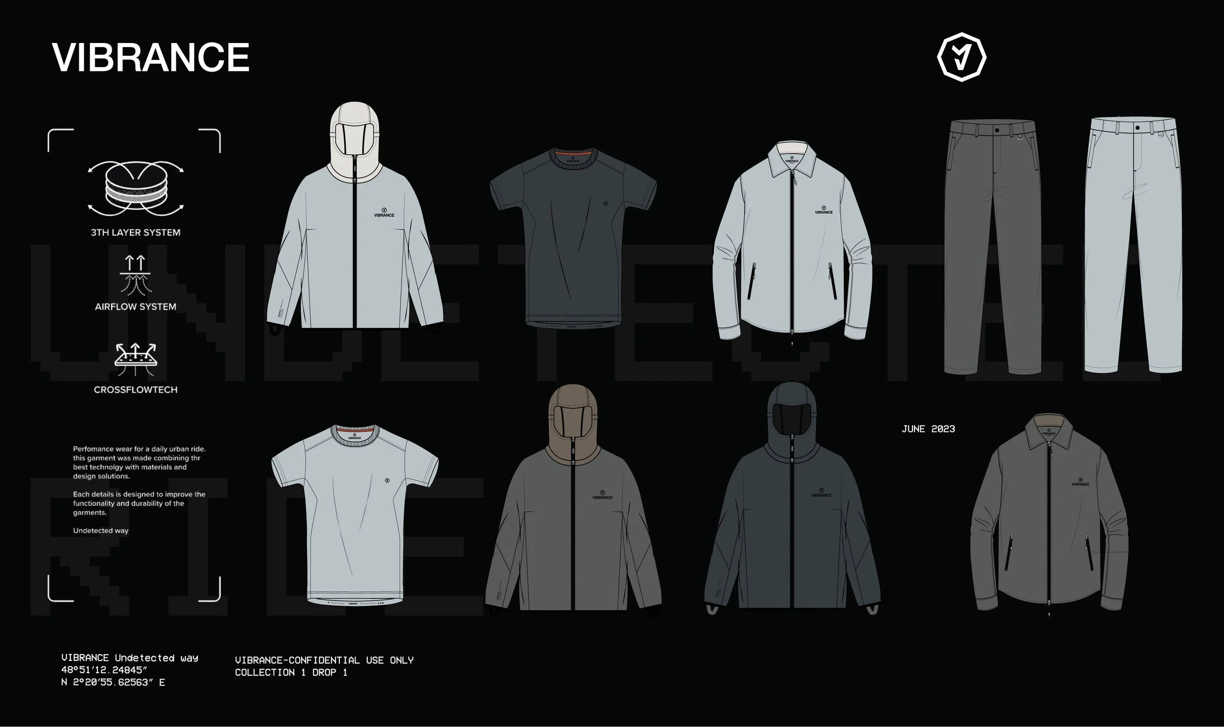 The core vision of Vibrance is based on the concept of “Undetected Ride”: a way of moving through the urban environment that allows riders to navigate the city more efficiently than by metro or car, creating their own paths and redefining everyday mobility. Cycling is positioned as a tool for freedom, speed and adaptability, shaping a brand aesthetic that blends technical cycling clothing with a minimal, contemporary urban look.